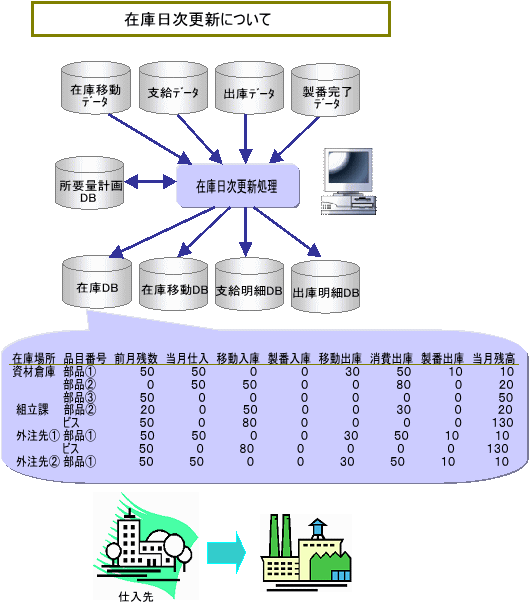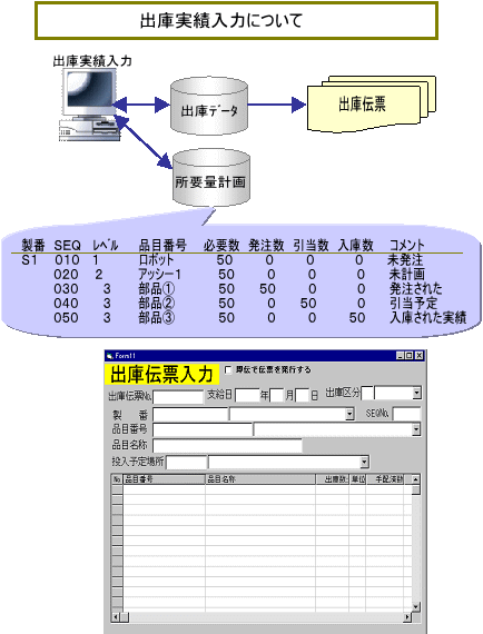 ・システム的には、当出庫実績を入力する事で、所要量計画DBに作成された管理用の情報へ、該当品目が入庫した旨の実績を更新します。