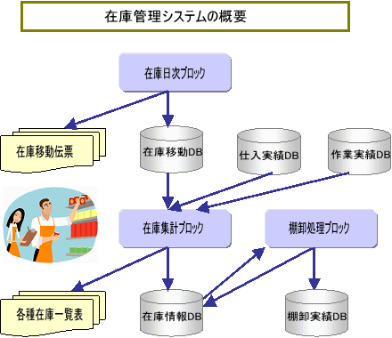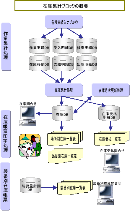 ・在庫集計ブロック:在庫移動実績、仕入実績、作業実績情報等より在庫移動情報を収集・計算し、各種在庫帳票を出力します。