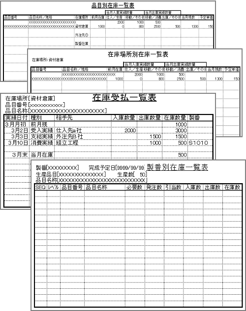 ・製番別在庫一覧表では、所要量計画データベースに更新されている実績情報により作表されます。