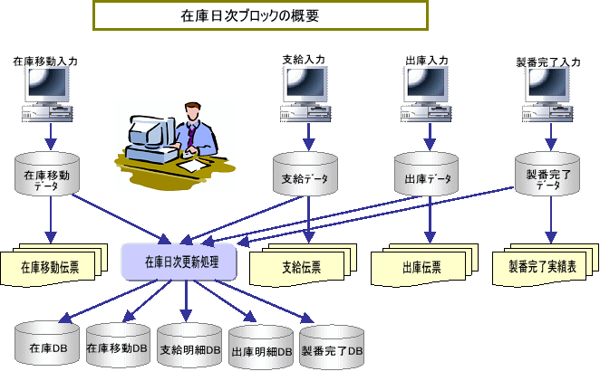 ◆在庫集計ブロックでは、在庫に関係する各種明細ファイルを使用し、在庫集計処理を行い、在庫データベースを更新します。